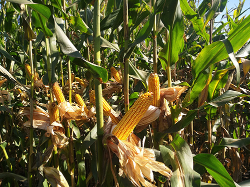 普通機收玉米品種。在適應(yīng)區(qū)出苗至成熟生育日數(shù)為117天左右,需≥10℃活動積溫2300℃左右。該品種幼苗期第一葉鞘紫色,葉片綠色,莖綠色。株高300厘米,穗位高113厘米,成株可見14片葉。果穗圓筒型,穗軸紅色,穗長19.0厘米,穗粗4.8厘米,穗行數(shù)14~16行,籽粒偏馬齒型、黃色,百粒重37.7克。兩年品質(zhì)分析結(jié)果:容重758~788克/升,粗淀粉70.80%~73.53%,粗蛋白12.40%~12.97%,粗脂肪3.88%~4.49%。兩年抗病接種鑒定結(jié)果:感(7)大斑病,絲黑穗病發(fā)病率12.4%~16.7%,莖腐病發(fā)病率11.1%~16.9%。